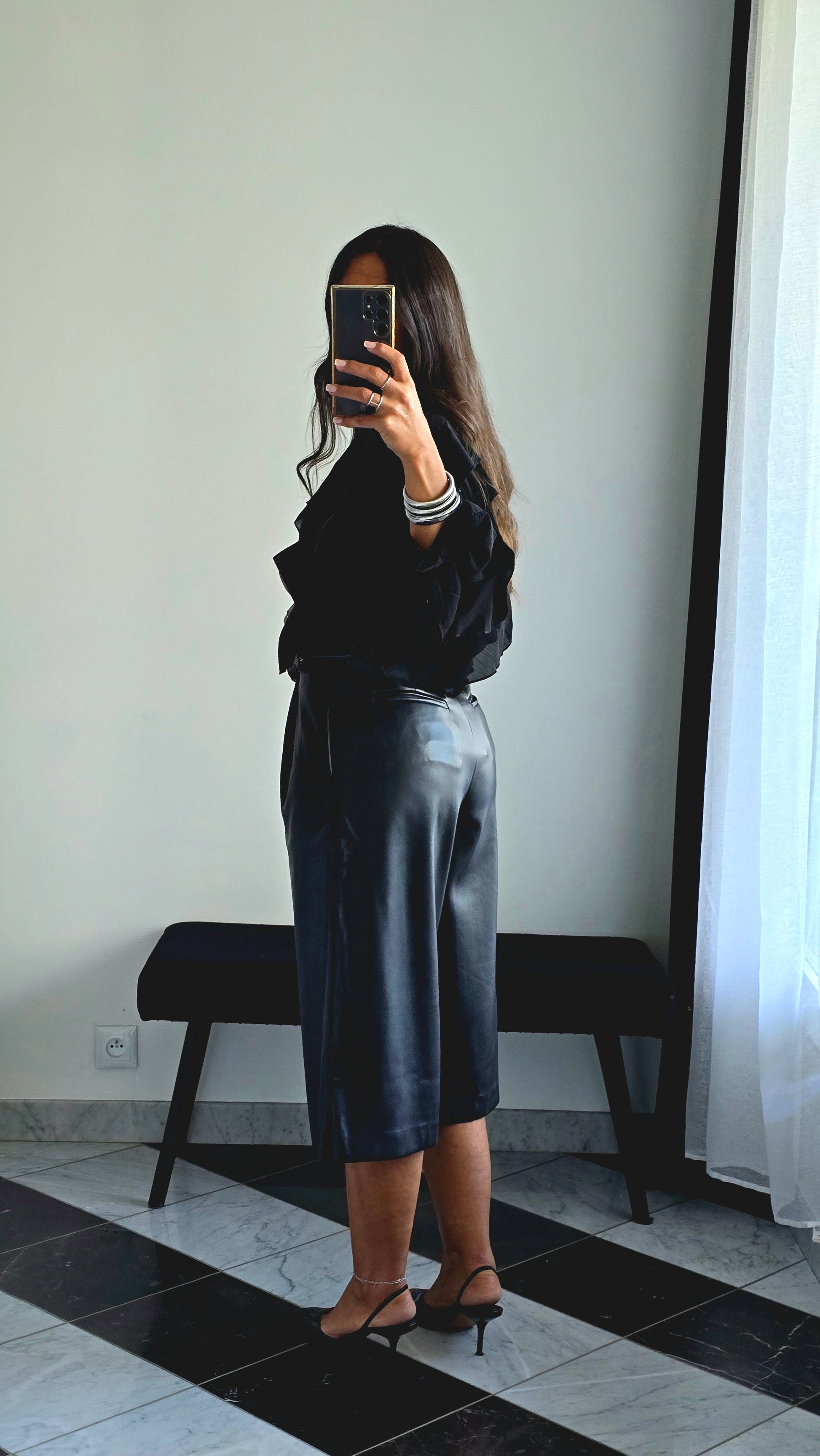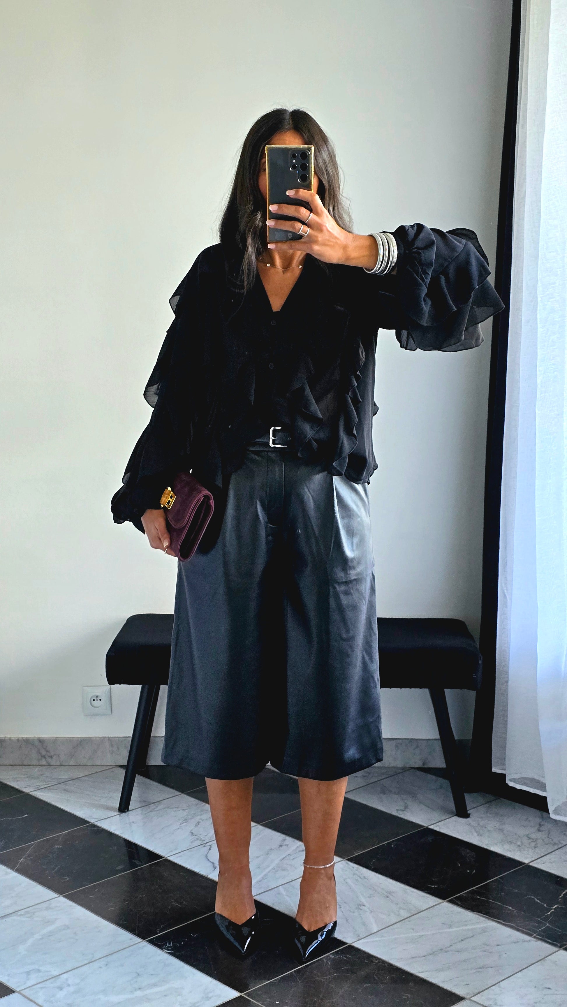 Pièce forte et sophistiquée, ce bermuda en simili cuir noir revisite le classique du tailoring dans une version moderne et audacieuse. Avec sa coupe longueur genoux et sa matière texturée, il apporte un style affirmé, entre élégance et allure contemporaine.