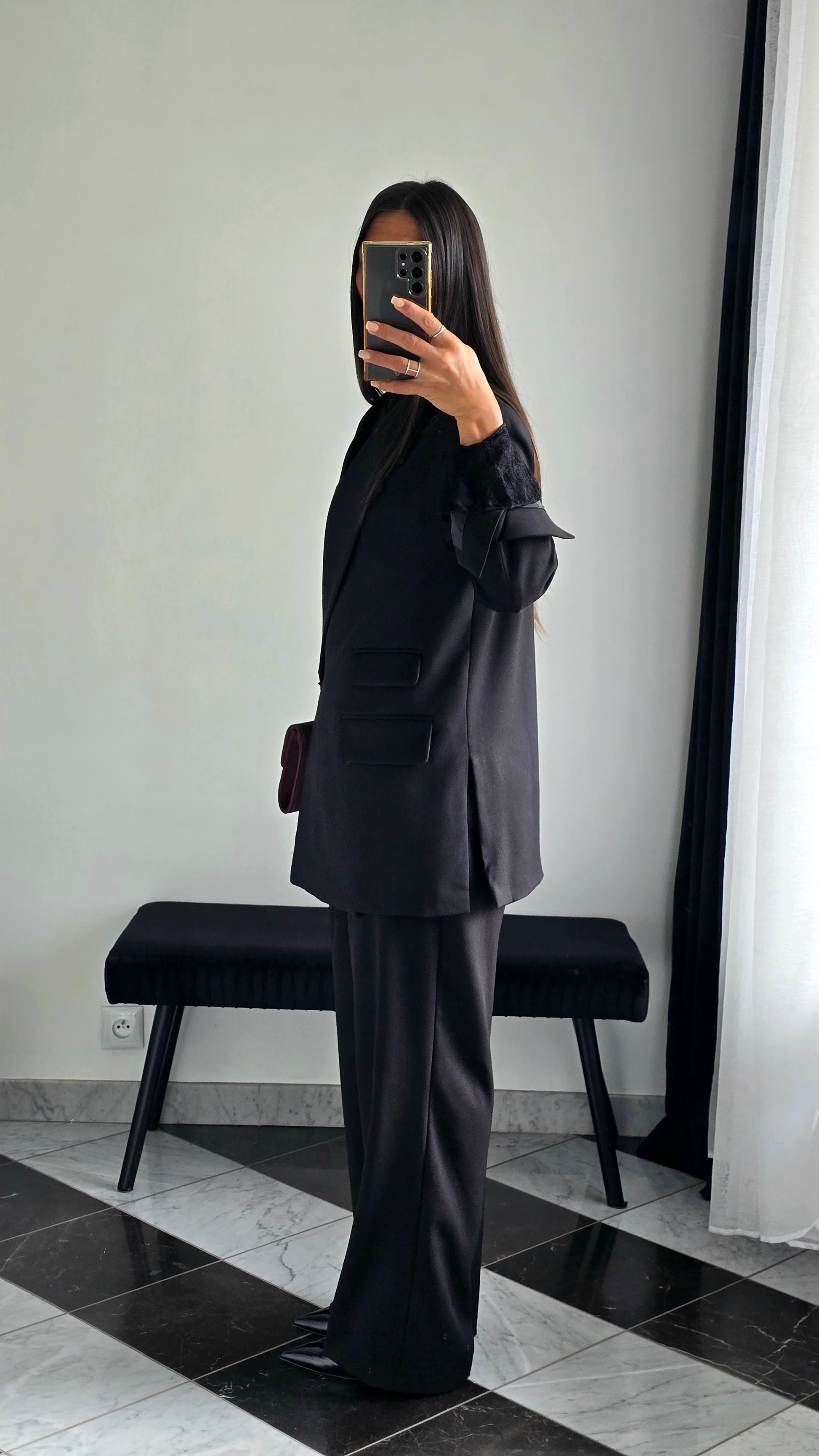 Version ensemble chic : avec le pantalon tailleur texturé noir et un haut en dentelle, pour une silhouette sophistiquée et féminine.