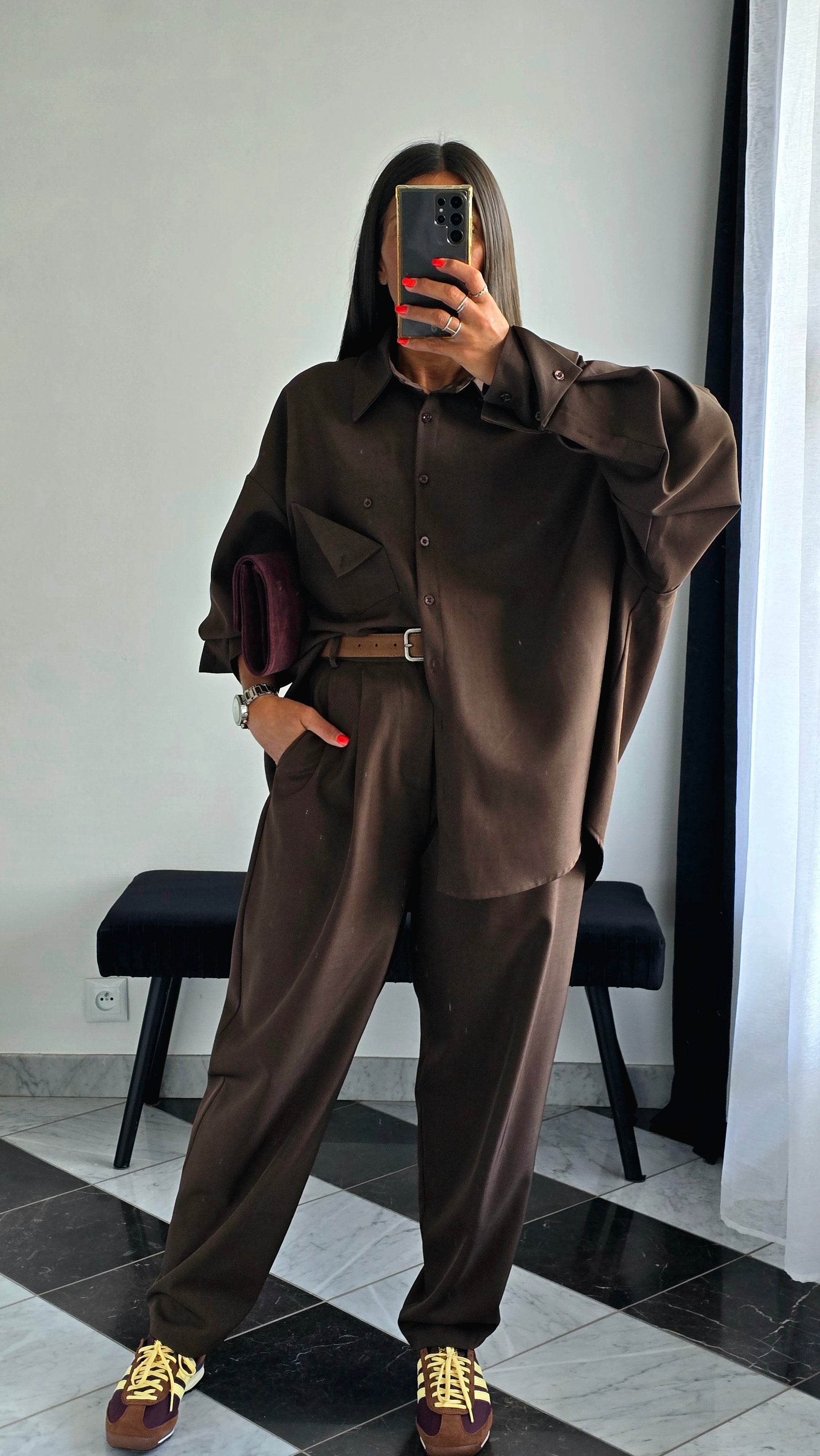 En ensemble avec la chemise assortie pour une silhouette monochrome tendance