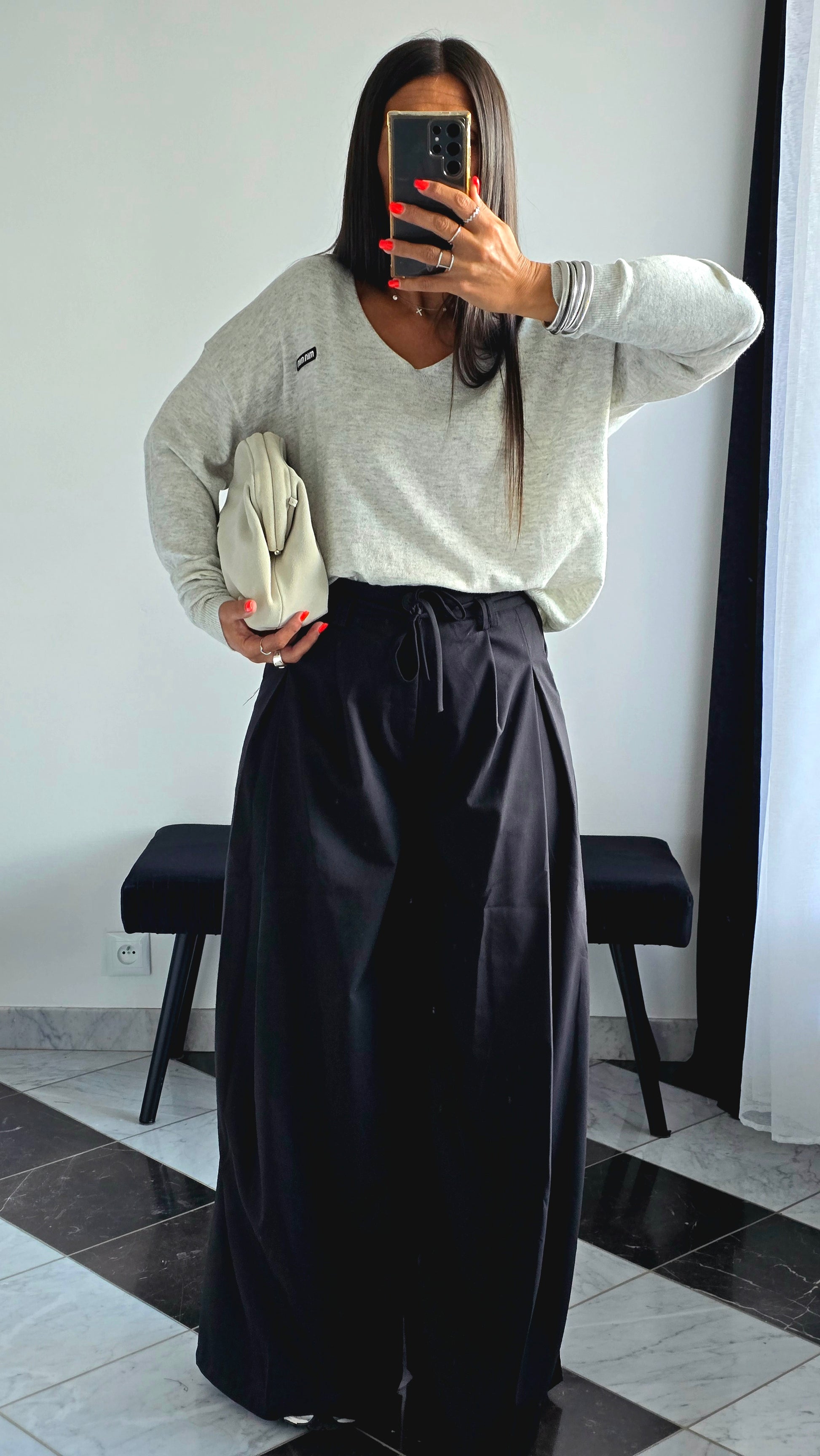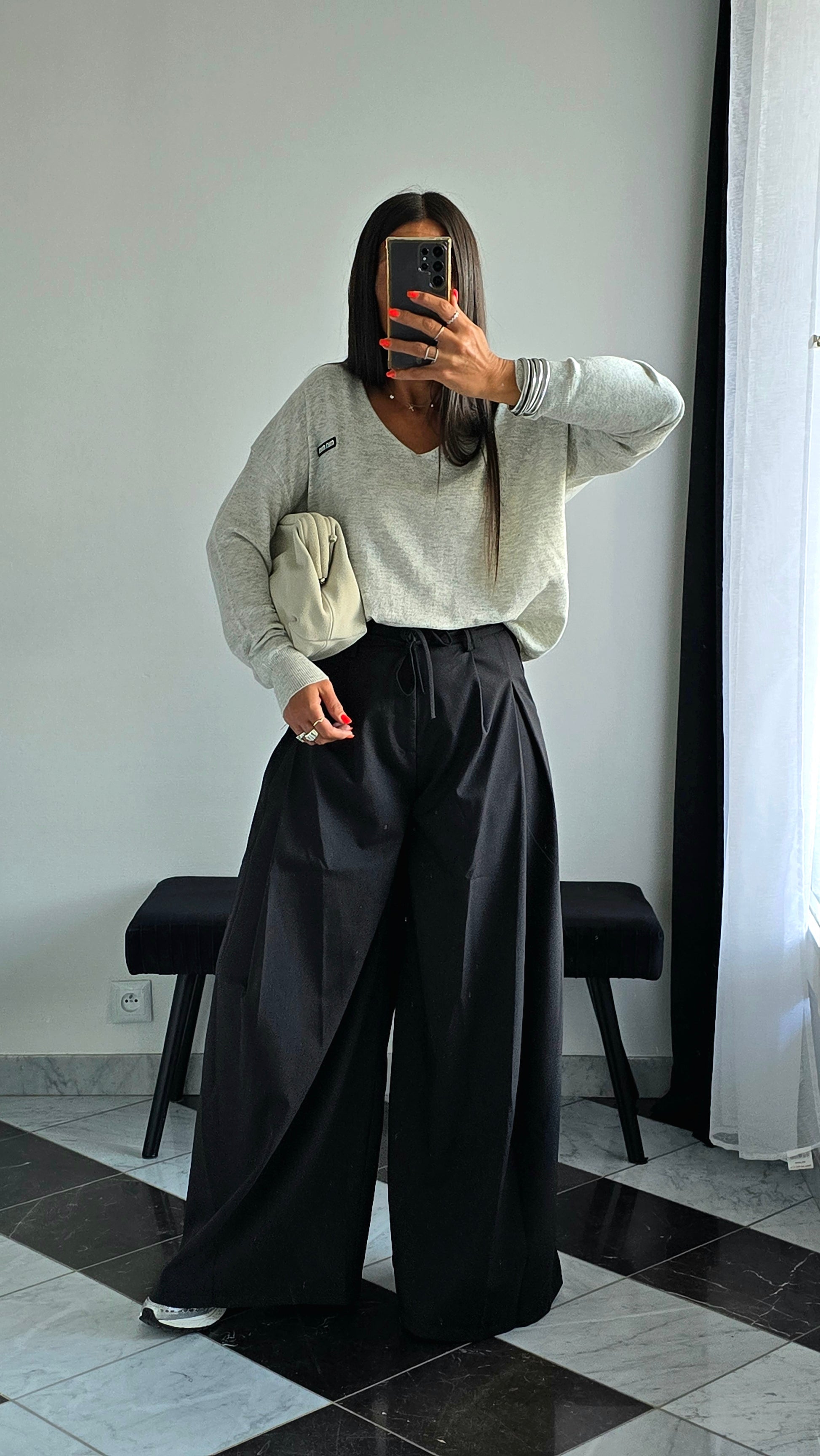 Ce pantalon noir adopte une coupe palazzo ultra-large qui allonge la silhouette et donne une allure élégante et affirmée. Conçu avec de profonds plis et des pinces à l’avant, il apporte de la structure tout en gardant un tombé fluide. Sa taille mi-haute avec lien de serrage apporte confort et ajustement, tout en permettant de le porter aussi bien de manière chic que décontractée.