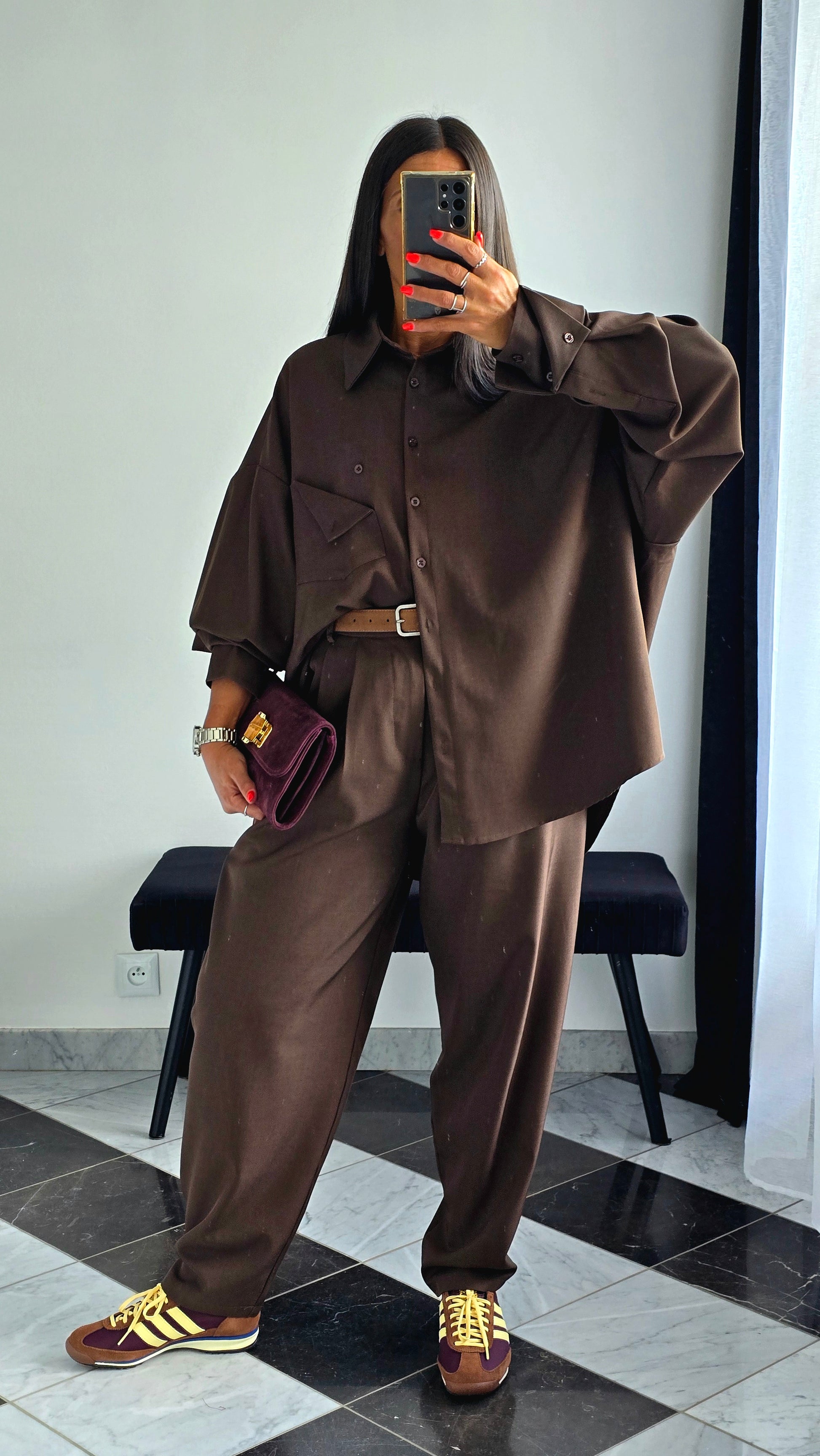 Avec un ensemble chocolat ou beige, pour un contraste élégant et automnal