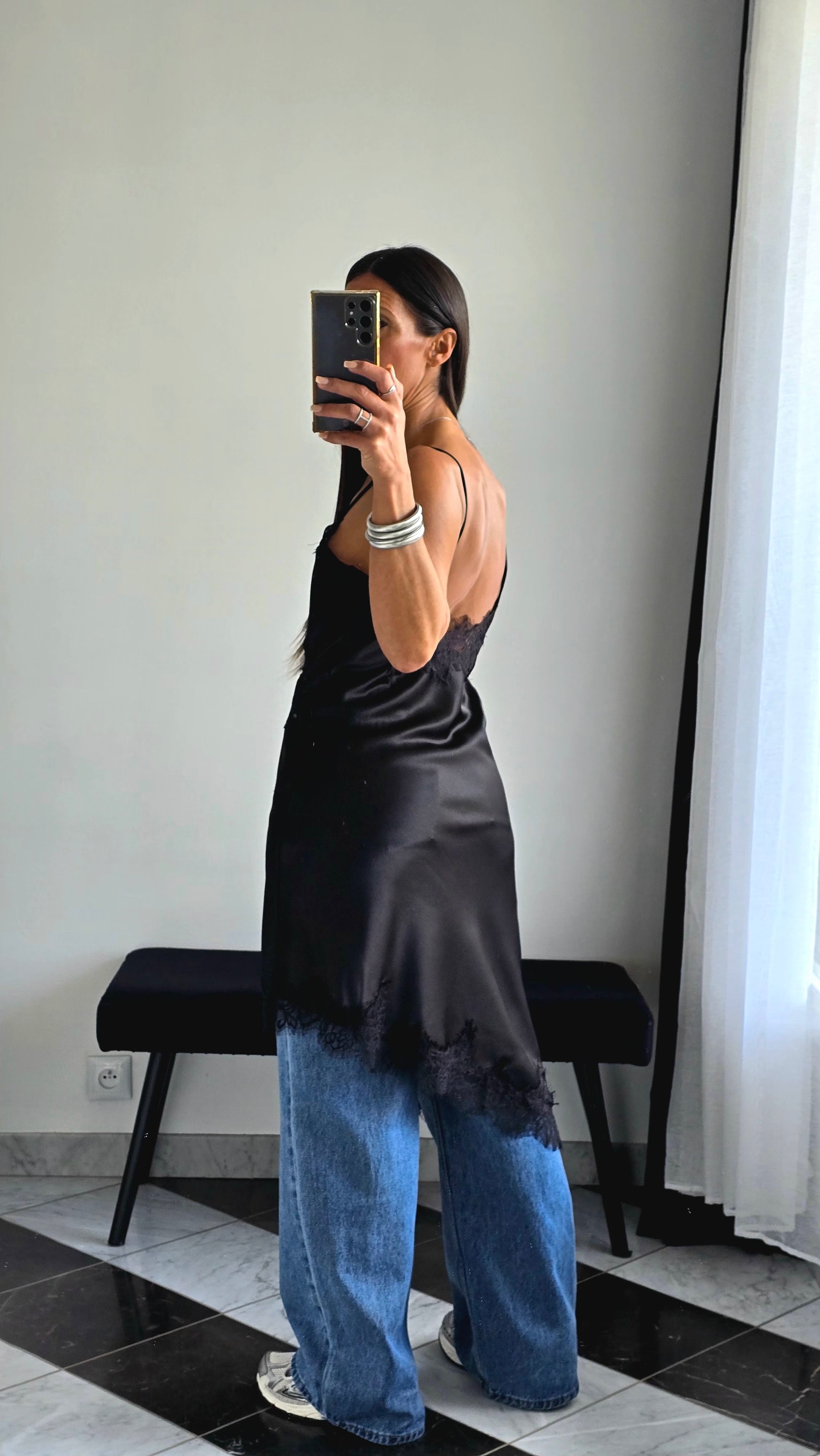 Cette robe noire en satin fluide, rehaussée de finitions en dentelle délicate, incarne l’élégance intemporelle.