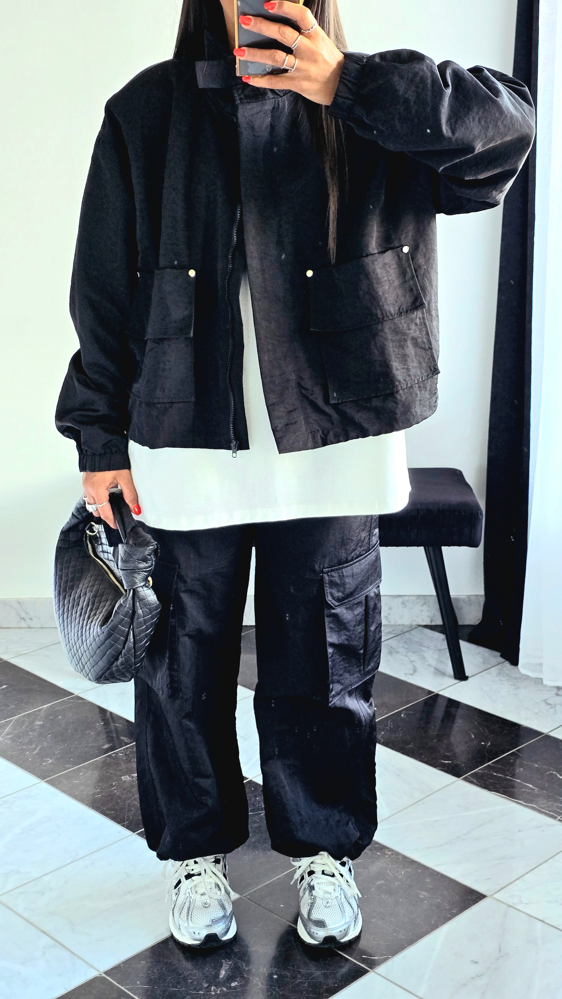 En total look avec le pantalon cargo assorti et des baskets pour un style urbain affirmé.