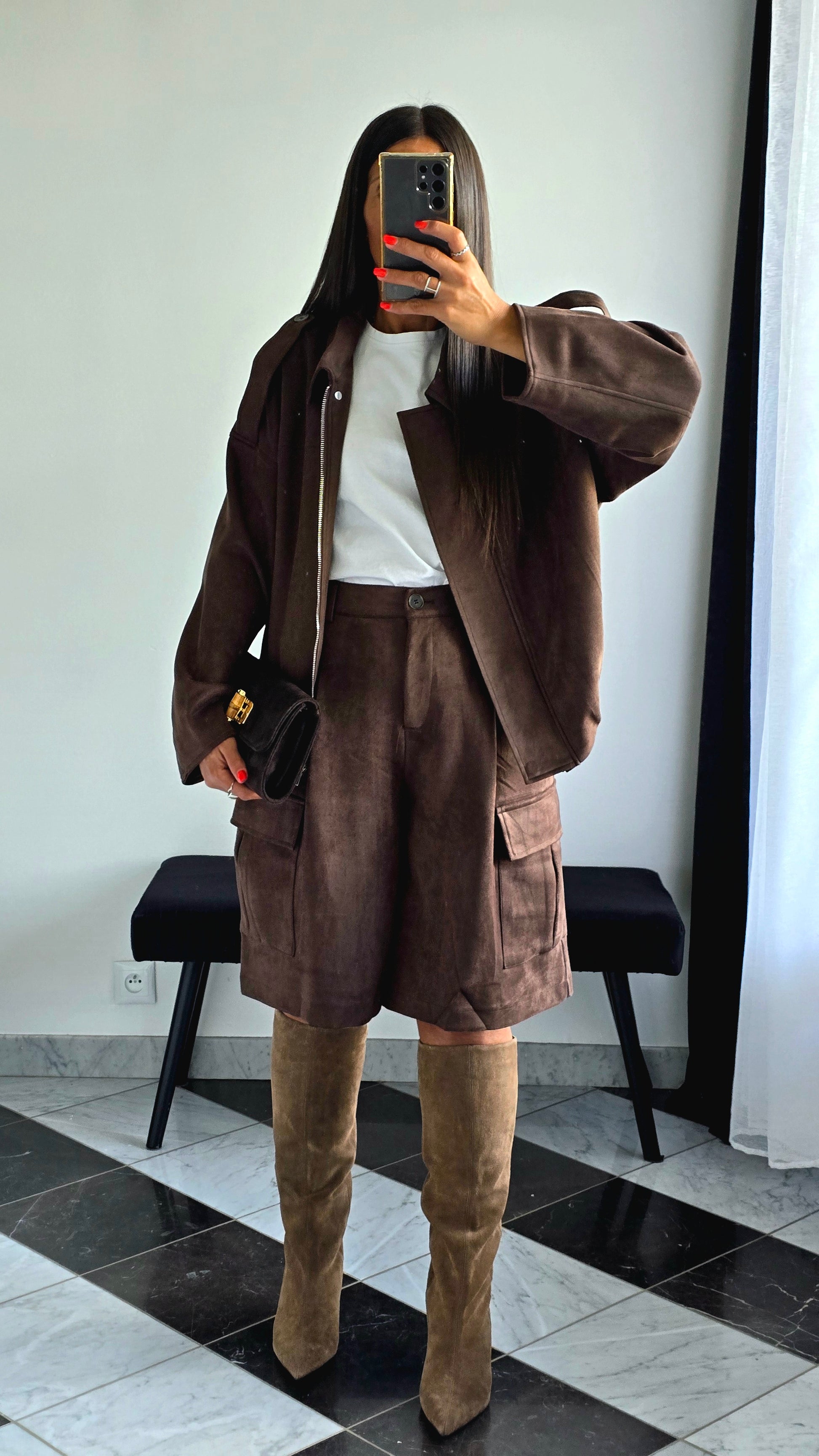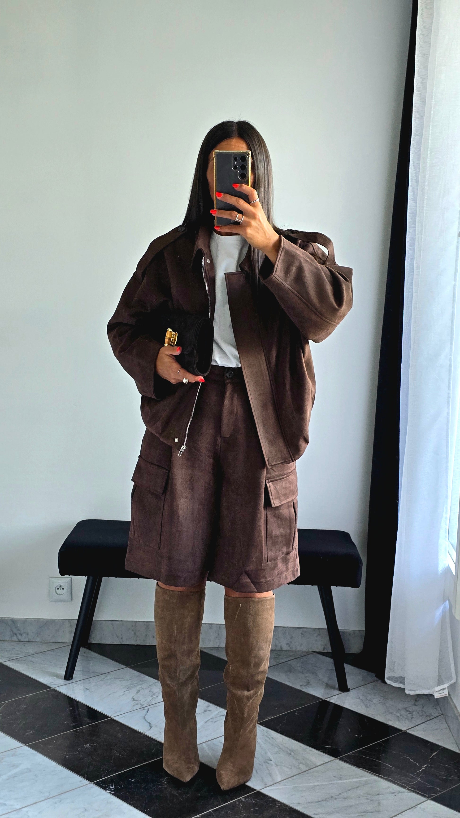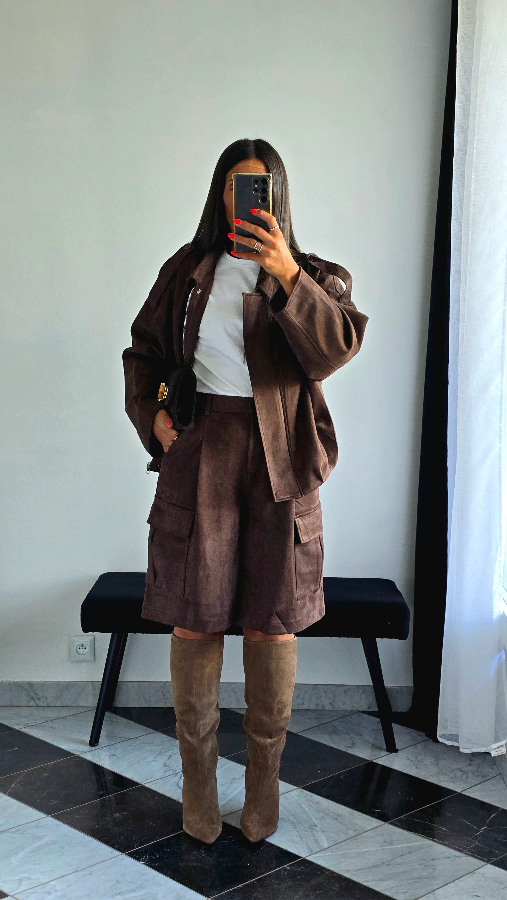 En ensemble coordonné avec le bermuda chocolat et des bottes hautes : un look pointu et tendance