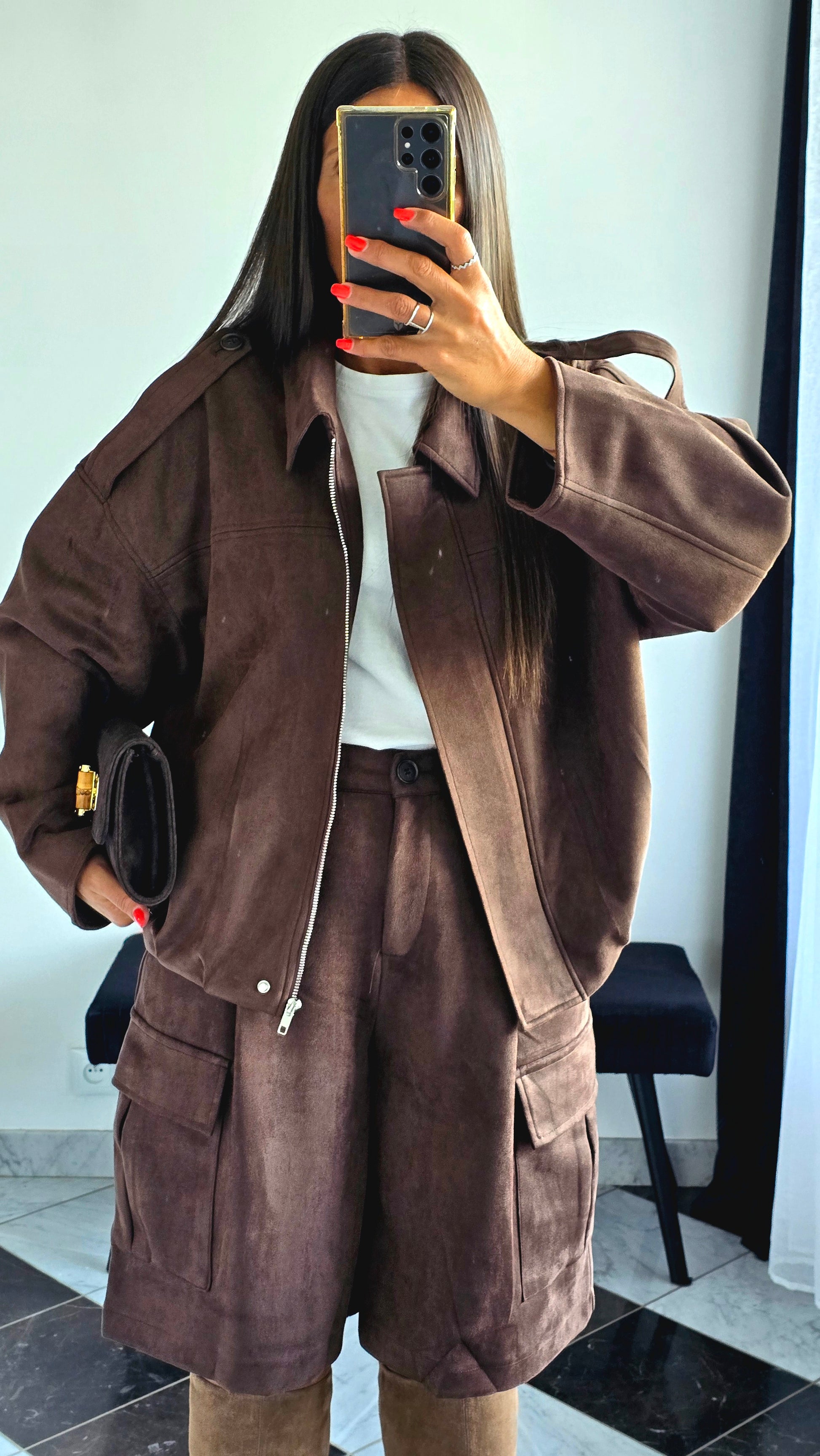La Veste Chocolat est une pièce forte et élégante, pensée pour sublimer vos looks d’automne-hiver. Conçue pour être portée en coordonnée avec le bermuda assorti, elle se mixe aussi parfaitement avec d’autres basiques : un jean brut, un pantalon tailoring ou encore une jupe près du corps.
